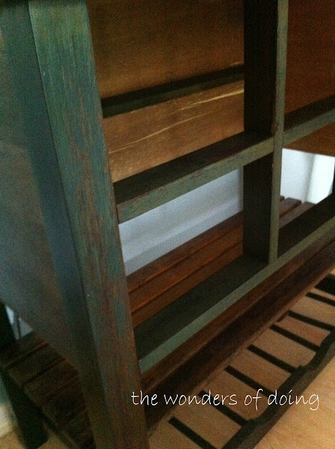 I love how the stain went over the green color on the legs of the piece and soaked into the spots where the green was worn off. It mixed together beautifully.